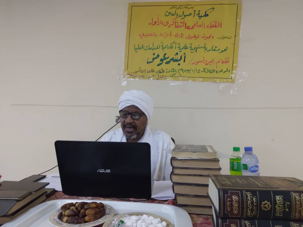 أقامت كلية أصول الدين ضمن أنشطتها العلمية الثقافية اللقاء العلمي التفاكري الأول للعام ٢٠٢٣م صباح اليوم الثلاثاء ٢٤ يناير ٢٠٢٣ بقاعة البروفيسور الفاتح الحبر بكلية الاقتصاد مركز الطالبات تحت عنوان الحديث الموضوعي تاريخه وأنواعه وتصنيفه تحدث فيه البروفيسور أبشر عوض إدريس الأستاذ بقسم السنة وعلوم الحديث متناولا الحديث الموضوعي موضحا تعريفه وأنواعه وتصنيفه ٠٠ بحضور نائبة عميد كلية أصول الدين د.نجاة حسن وعدد من أعضاء هيئة التدريس بجانب طلاب وطالبات الدراسات العليا قسم السنة وعلوم الحديث٠٠